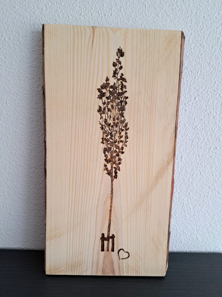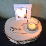 - Een boomschijf met uitsparing voor een foto/kaart en kaarsje